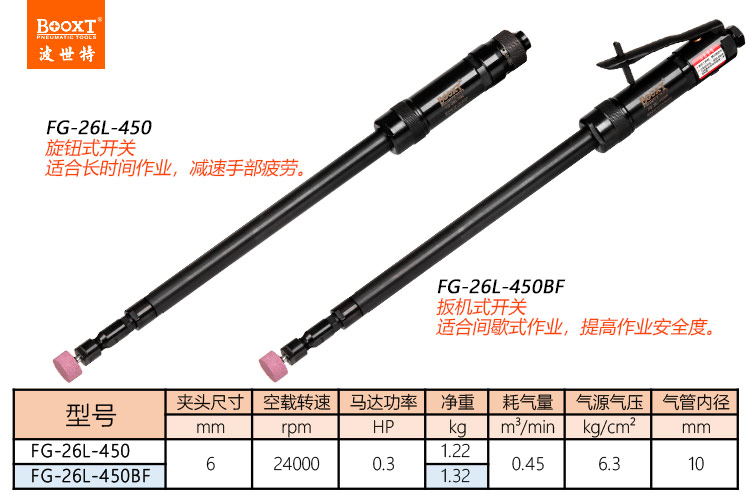 東莞市強(qiáng)勁五金工具有限公司提供臺(tái)灣BOOXT波世特品牌氣動(dòng)工具,加長(zhǎng)氣動(dòng)直磨機(jī)FG-26L-450BF廠家直銷,首件享特價(jià)。咨詢熱線:4008301980