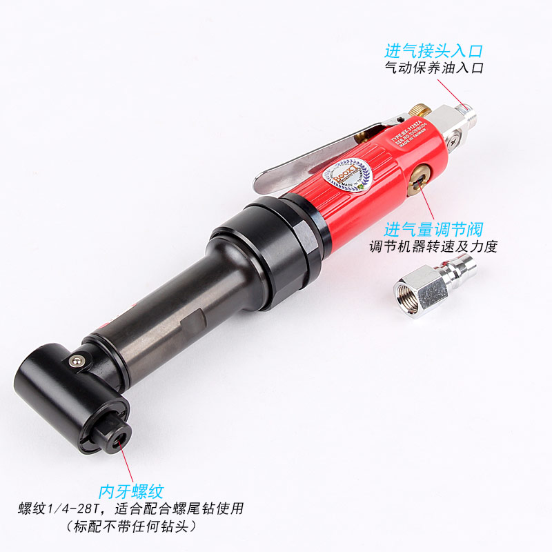 • 產品參數: 夾頭尺寸:1/4"*28T 空載轉速:2500rpm 彎角高度:50mm 全 長:286mm 重 量:0.92kg 耗 氣 量:0.38M3/min