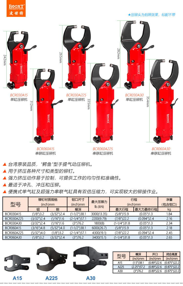 東莞市強勁五金工具有限公司提供臺灣BOOXT波世特品牌氣動工具,雙聯(lián)缸氣動壓鉚槍BCR060A225廠家直銷,首件享特價。咨詢熱線:4008301980