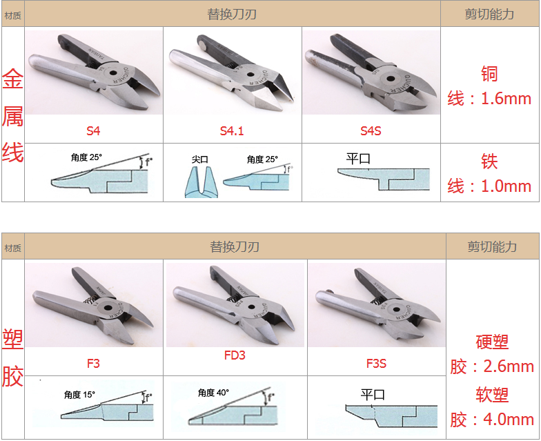 2.注意材質(zhì):材質(zhì)對選配刀刃非常重要,例如客戶要剪的銅鐵、材質(zhì)有鍍鈦、鍍烙、塑料材質(zhì)、加纖維超過20% 時,一般刀刃不是剪不斷,就是使用壽命大大減少,塑料還容易在剪斷過程中碎裂。在這情形S刀刃應(yīng)選擇Z刀,塑料則建議使用電熱剪。