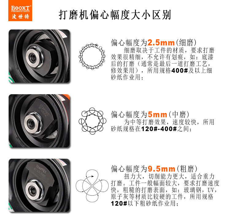 --粗磨偏心度幅度為9.5mm,扭力大,切削能力更大,適合重力打磨。工件一般幅面較大,要求打磨速度快,粗糙的打磨表面,如:玻璃鋼,UV,原子灰等材質比較硬的工件,所用砂紙規(guī)格120#以下;